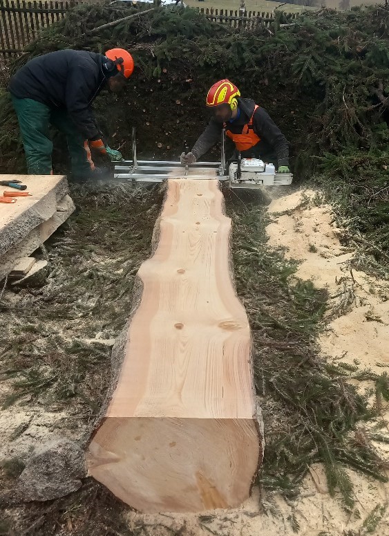 - pořez kmenů na sortimenty (řežeme fošny přímo na místě z pokácených stromů)